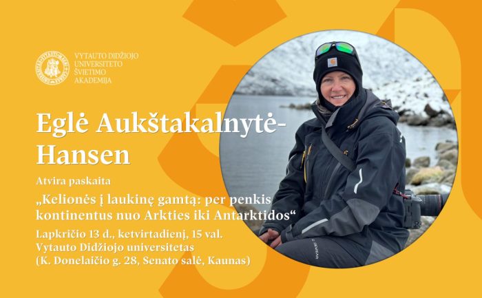Lapkričio 13 d., ketvirtadienį, 15 val., Vytauto Didžiojo universitete (S. Daukanto g. 28, Senato salėje, Kaune) įvyks rašytojos, fotografės ir keliautojos, LRT laidos „Laukinis Eglės pasaulis“ vedėjos Eglės Aukštakalnytės-Hansen atvira paskaita „Kelionės į laukinę gamtą: per penkis kontinentus nuo Arkties iki Antarktidos“.
